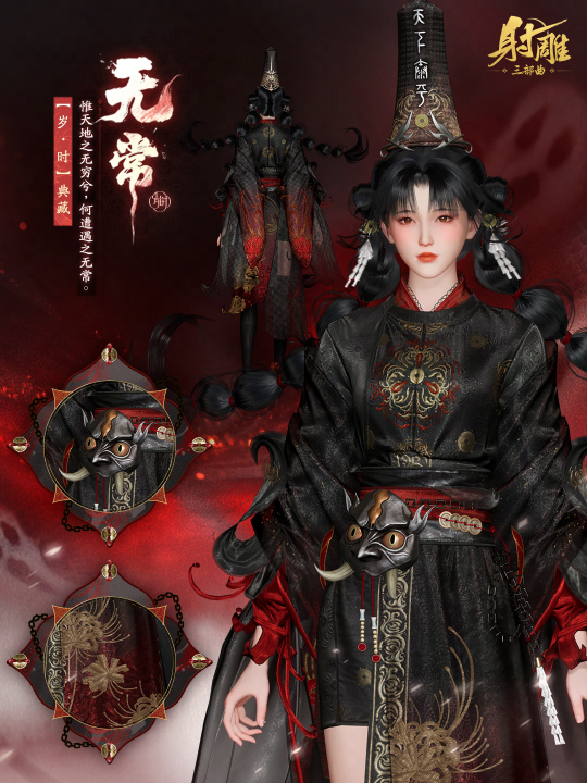 中元夜,无常至,这套凝结着民俗文化与现代美学的【无常】外观,既是对传统神祇形象的演绎,也是江湖儿女体验民俗传说的媒介。当少侠化作黑白无常,行走在《射雕》的世界里,或许能感受到那份 善者见喜,恶者见惧” 的古老情感。
