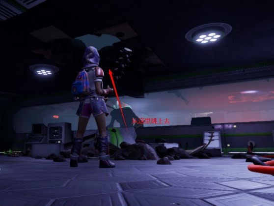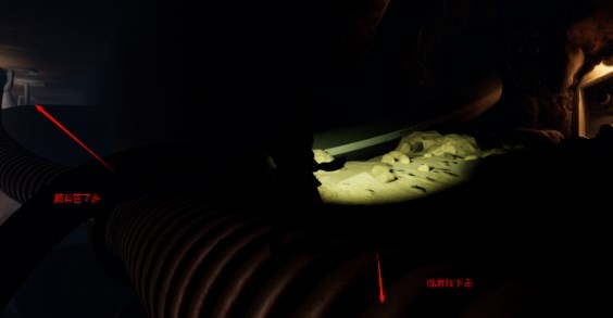 然后贴着右边走,上面是白色的管子,跟着管子走到这个位置,跳下去受虎蚊攻击的可能性会小,路也更短一些