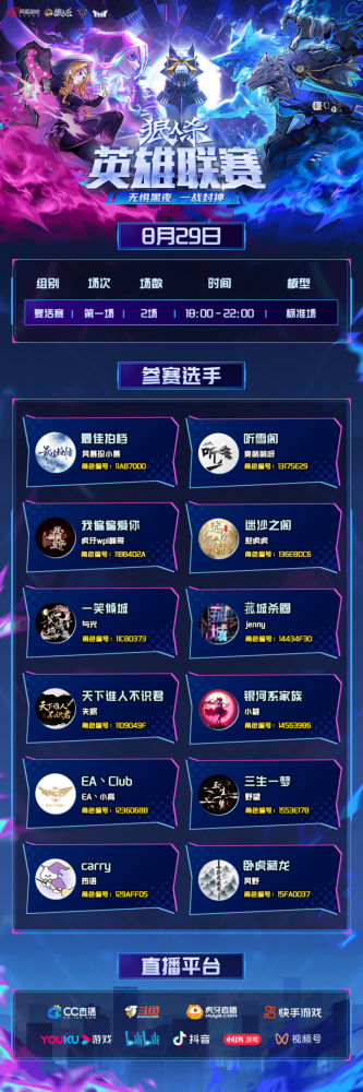 无惧黑夜,一战封神!2025狼人杀英雄联赛已进入最后冲刺阶段。截至目前,总决赛仅剩最后一席名额尚未确定,人气复活赛即将开战,谁将绝地反击、突出重围,拿到最后一张通往总决赛的门票?终极悬念,即将揭晓!