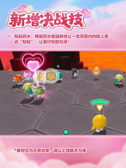 天灵灵地灵灵,七夕贴贴行不行!全新决战技<贴贴药水>浪漫来袭!释放药水后能强制性让一定范围内的敌人靠近贴贴”,让蛋仔如胶似漆!