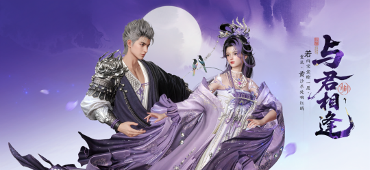 【与君相逢·普通礼盒】包含【双人动作·缘定三生】、【时装·与君相逢】、【发型·青空紫霞】、【头饰·银汉长空·男】或【耳饰·青空紫霞·女】、【腰饰·定情木匣】、【背饰·心心相印】,【背饰·宵月鹊桥】。