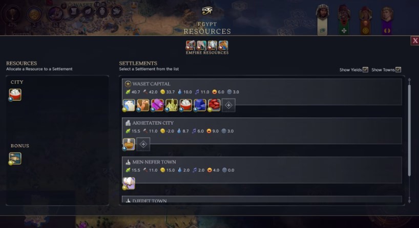 如上所述,你可以将特定类型的资源分配给你的城市和定居点。每个定居点基于其重要性具有不同数量的初始资源槽位:首都槽位最多,城市次之,而城镇只有一个槽位。槽位数量可根据一系列因素增加。在定居点建造特定建筑可增加资源容量,骆驼资源也可增加城市容量!请观看这段短片,了解资源的运作方式: