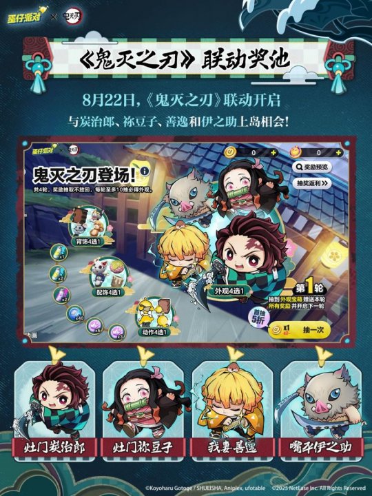 呼吸全集中,蛋仔们的观看视线也全集中!国民原创乐园游戏《蛋仔派对》×《鬼灭之刃》联动于8月22日重磅开启,<灶门炭治郎>、<灶门祢豆子>、<我妻善逸>和<嘴平伊之助>四款联动外观上线!欢迎加入全新冒险,携手新朋友们碰撞趣味的火花~