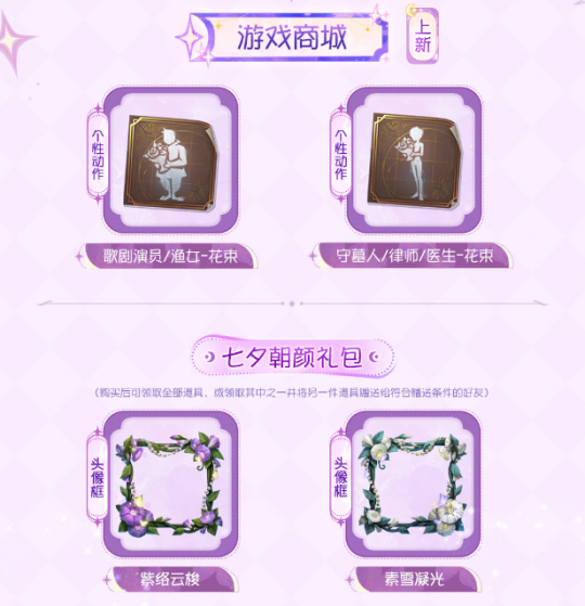 除了返场,游戏商城还上新了5款个性动作,分别为歌剧演员/渔女-花束和守墓人/律师/医生-花束;更有七夕朝颜礼包同步上线,内含【头像框】紫络云梭河【头像框】素雪凝光,购买后可领取全部道具,或领取其中之一并将另一件道具赠送给符合赠送条件的好友,表心意的时候来啦,访客们可不要错过!