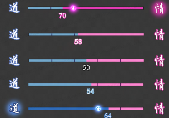 简单来说,在登场时王重阳会处于情道相平衡的状态。随着战斗的进行,情道值也会因少侠们的行动而动态调整。当道值逐渐压倒情值,王重阳会由于道值的提升不断强化自身技能。
