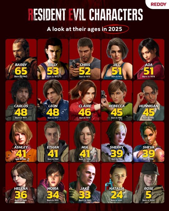 Reddit玩家分享了截至2025年《生化危机》系列主要角色的年龄,基于游戏设定和官方资料中的出生年份。年龄按照2025年计算,有些角色的年龄可能因病毒或霉菌影响而减缓衰老,部分角色的出生年份为推测。