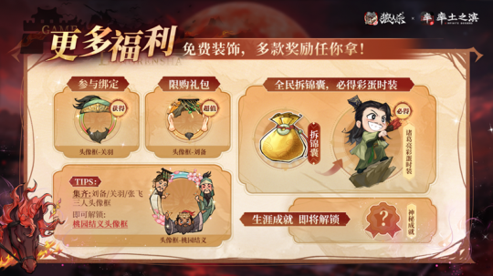 参与全民拆锦囊玩法,还将获得诸葛亮彩蛋时装,更有机会获得网易狼人杀卡牌礼盒、率土之滨礼盒等超值福利,参与互动集齐刘备、关羽、张飞三人联动头像框即可解锁桃园结义头像框,更多玩法等你来探索!