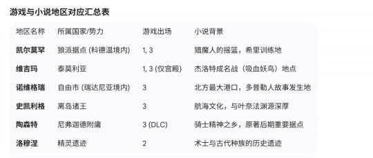 游戏在忠于小说地理和文化的基础上,加入了原创地点(如白果园、弗洛茨姆)和对次要地区的扩展(如威伦、洛克·穆因),丰富了《巫师》世界的沉浸感。