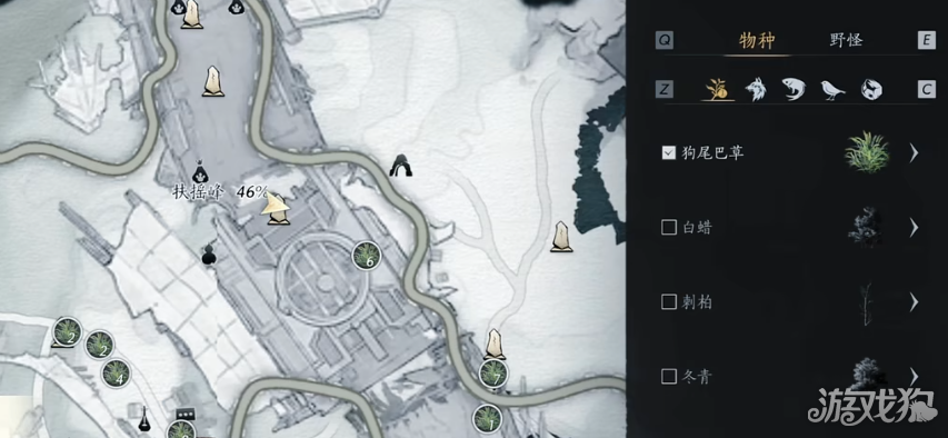 2、打开游戏的不见山地图,在物种分布选择草药-狗尾巴草,地图中就会显示当前狗尾巴草所在位置。