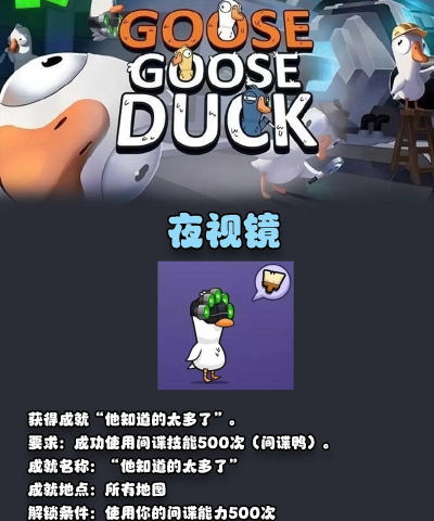 不止这些基础成就,针对特定的角色还会有专精类型的成就,能证明玩家扮演当下角色的表现,如果在游戏里以警长的身份开启挑战,那玩家就需要去游戏杀掉5名敌人,只要自身可以存活下来,就能获得我是法律的成就,也可以去杀死300名对手角色,但需要注意的是,一旦杀掉加拿大鹅,玩家也会死亡,这时候任务就会无法完成,如果在游戏是变形者,那就可以在游戏里记录死者位置,接着再去获得对方的相关线索,接着就能扮演角色,继续在游戏里完成后续的击杀,也可以以间谍鸭的身份揭露鹅的身份,揭露150次也能达成成就。