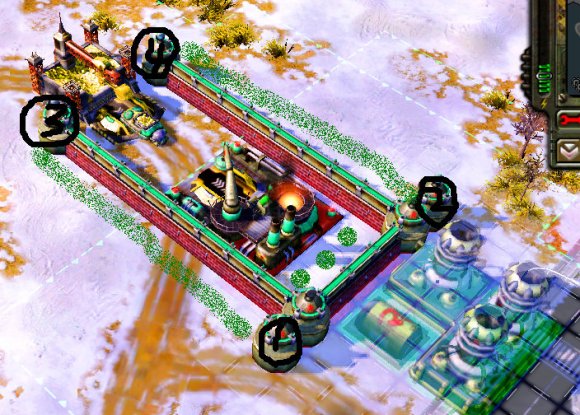 PS2:图中若有若无的大电就是告诉同学们,这种围墙背后由于从3进化成了5,是可以直接围上大部分建筑,省力省时加安全,并且这种距离大电爆炸是炸不到矿车的,同时又正好给矿位提供建造范围,这意味着苏联矿场被清理掉之后可以直接利用建筑范围重新补上哟~