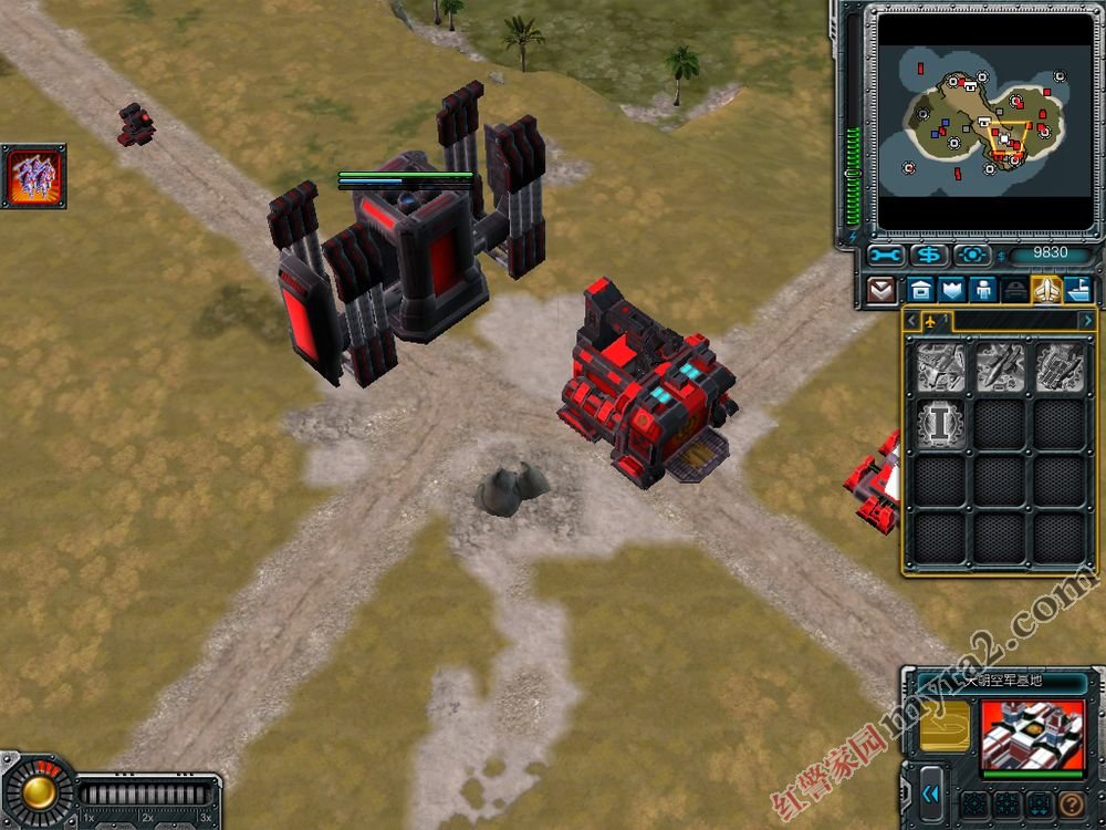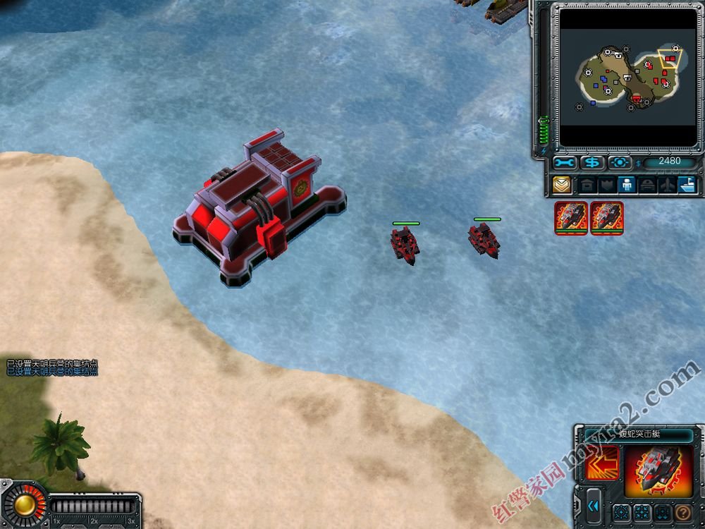 例如在无限岛,基于起重机有够大的维修范围,我们可以考虑把起重机放在下图这两个位置,这样就可以全方位的发挥起重机的维修效率。另外把无畏放在这个地方的话,不仅可以拆到对方的矿,还能支援中路的正面战场,这种打法的收益也是比较可观的。