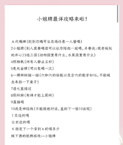2、基础规则:抽牌与对应任务游戏的核心是抽牌,每人轮流从牌堆抽一张,然后,根据牌面执行任务,比如,抽到A,可以指定一人喝,抽到2,就是“小姐牌”,有人受罚时,你要陪喝,抽到3,自己直接喝半杯,抽到4,可以玩“摸鼻子”,最后摸的人喝。