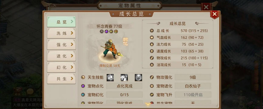 比如选攻宠,就重点看,物攻和速度资质,法宠则看法攻,血宠看气血和防御,不必追求全满,那样成本太高,找到核心资质,达标就可以,其他方面,用技能弥补。