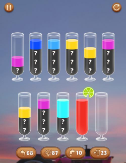 这里有个小技巧,优先处理,那种颜色数量少的,比如,某种颜色只剩两格,分布在两个瓶里,你就应该,尽快把它们合到一起,这样能快速,清空一个瓶子的顶部,为你创造操作空间,相反,如果某种颜色很多,暂时不用管它,先解决零散的颜色。