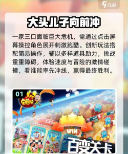 《大头儿子大冒险》你要控制着那位顶着硕大的头颅充满孩子气的大头儿子,去实现勇气大爆发去进行畅快淋漓的跑酷,游戏还在过程中引入了与动物之间创意十足的互动环节,还围绕着友情以及智慧等元素,设计了一些让我们内心产生激荡的故事情节,加入了滑板,独轮车等载具可以使用。