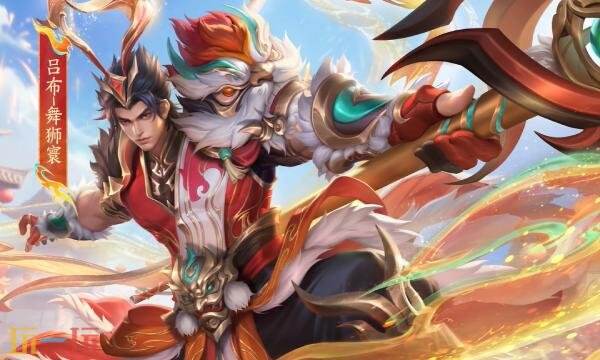 吕布化身为带来喜气的舞狮,一身红黑色劲装如狮身彩绸,火焰花翎似飞扬流霞。画戟起,彩头抛,脚踏喧天锣鼓声,即将降临峡谷贺新年!