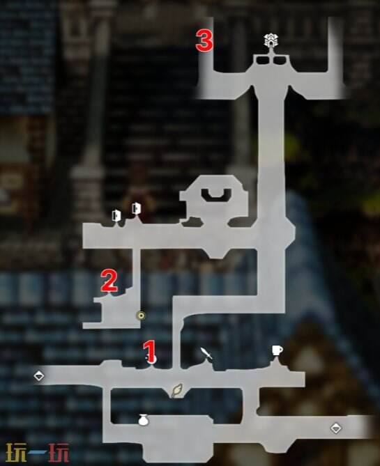 《歧路旅人 0》希亚特珀利斯有三处标记点位收集物,1 号为普通宝箱可开出中毒治疗药草 * 1,2 号是闪光点可拾取书信碎片,3 号为内含物品待补充的锁住宝箱,需推进火焰传承者主线至第六章并将据点教堂升级后解锁开启。