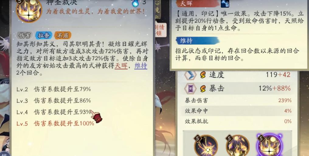 天照是稀有度为SSR的式神,定位是输出,抽到后无需犹豫,属于必养类型。还可以培养第二个同样类型,但是御魂搭配与技能要求不同的天照。四件套可选用狂骨、海月、隐念、真女等,两件套则需根据就业场景调整,可选择土蜘蛛、荒骷髅或者鬼灵歌姬。技能方面需要升满二、三技能,不过二技能满层后的造成击杀自拉条效果,在PVE副本中较少用到。因此在多数PVE副本中,三技能满层且二技能升至四级即可满足需求。
