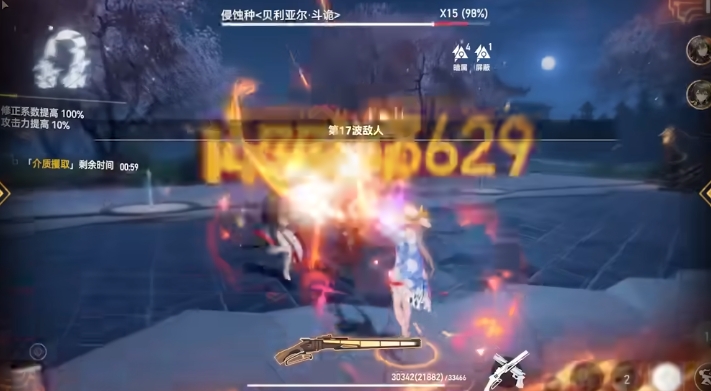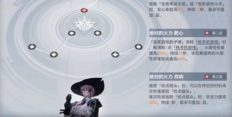 低练度可以通过跃迁吃满增伤,释放三技能时根据队伍中火属性队友数量增加暴伤,适合给火队打辅助使用。中线为输出神格,有自我会心率、火伤和攻击力提升的增伤buff,释放给点甜头后收枪闪金光时能触发美式居合,跟中线樱切的拔刀斩相似,不过专钥对其增伤较小,整体强度不如左线,而且自动操作时会丢buff。至于选哪个神格则看硝芒埃克什瓦的阶级,如果是SS1加二起步就选左线交给自动操作走辅C。