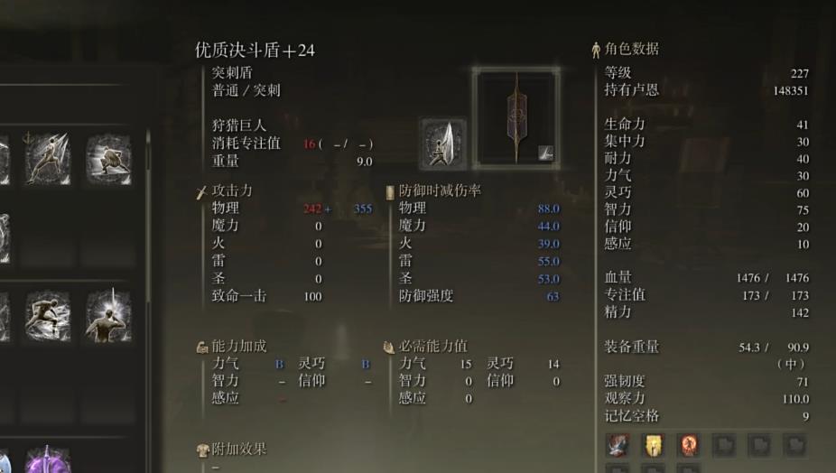 决斗盾是由长剑与盾牌组建成的武器,在攻击的同时可以保持防御值。作为新武器总共有两把,都可以在幽影城拿到,分别是普通决斗盾和卡利亚突刺盾,且二者都属于非失色武器。决斗盾虽然不具备全物理防御能力,但是在中型护盾里防御能力都处于较高水平。卡利亚突刺盾则有所不同,虽然对智力有要求,且附带魔法伤害,补正同样与智力相关,不过其防御强度已达到大盾级别。并且物理防御和魔法防御属性更高,可以说是全面超越普通决斗盾。