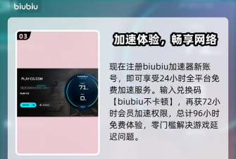 为保障更稳定的运行环境,biubiu集成帕拉斯引擎3.0技术,具备毫秒级网络状态感知能力,可实时识别带宽瓶颈、DNS异常或路由绕行等潜在问题,并自动触发适配策略。现面向所有用户提供限时福利:输入兑换码【biubiu001】即可领取三天免费加速时长;新用户完成注册后,额外获赠24小时基础体验时长,两项权益可叠加,最高享96小时连续加速服务。