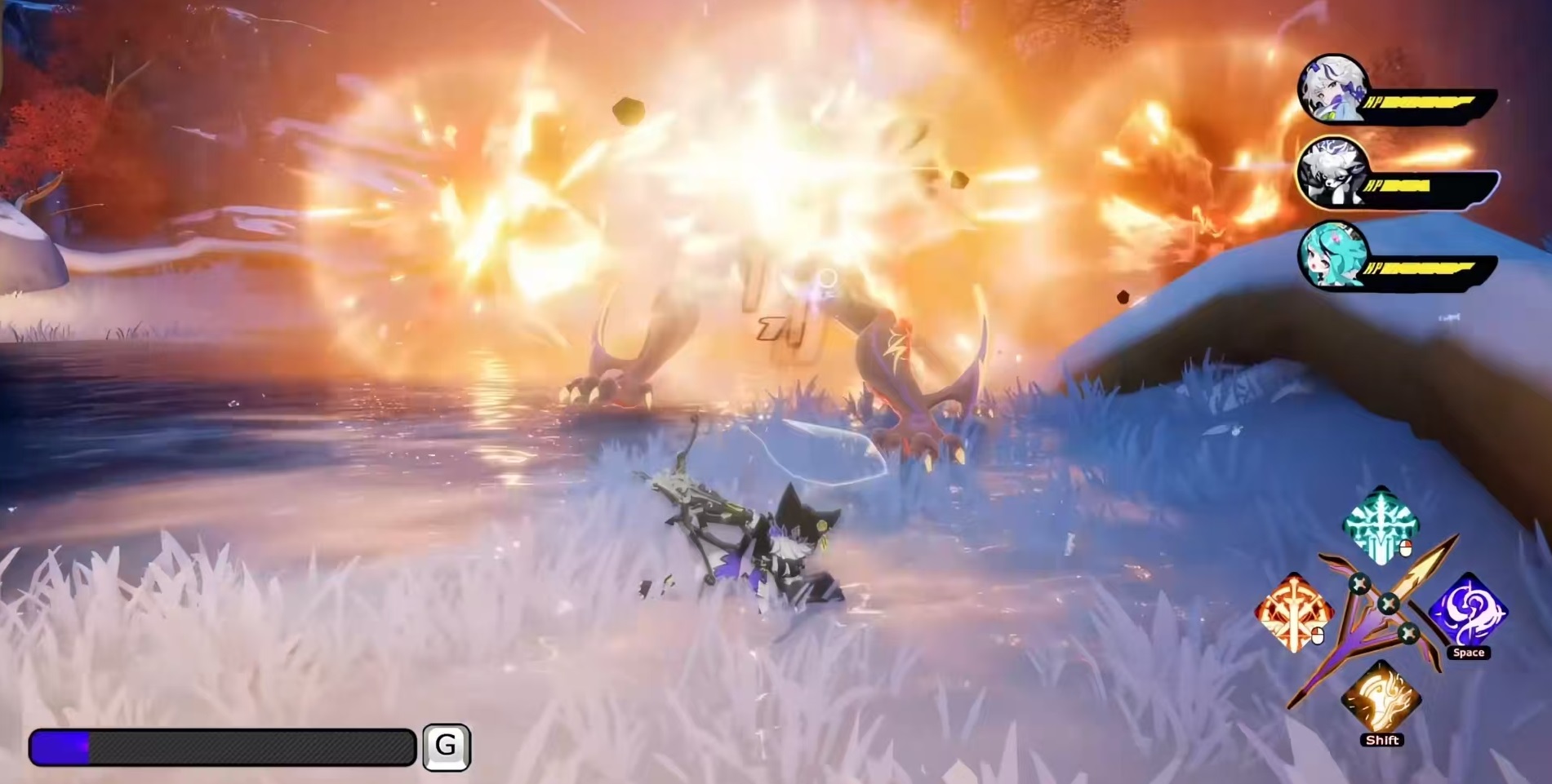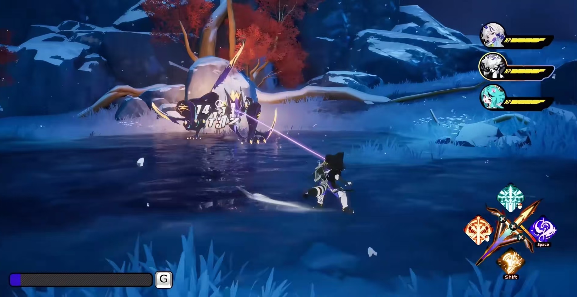 在战斗方面采用的是多角色无缝切换连接的模式。玩家可以组建好三人小队,随时进行切换。根据不同角色特点,能够进行近战拼刀,远程TPS,元素爆发自由组合、钩锁位移等。打出来的连招非常流畅,压迫感强。积攒能量后就可以开启领域,此时进入到敌方时间暂停状态,我方全员上场进入三消模式。通过消元素块来积攒能量,放合体大招。利用这一特色就实现了动作和策略的结合。战斗围绕弹刃值等资源循环展开,普攻可以随时插入技能或闪避,从而派生出多种连招,例如弹反、对波、硬直、弱点破坏等,这些都是和boss战斗中要掌握的技巧。