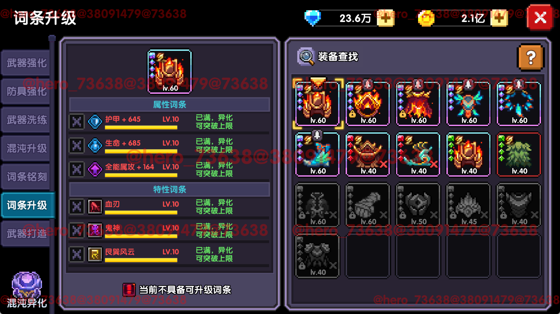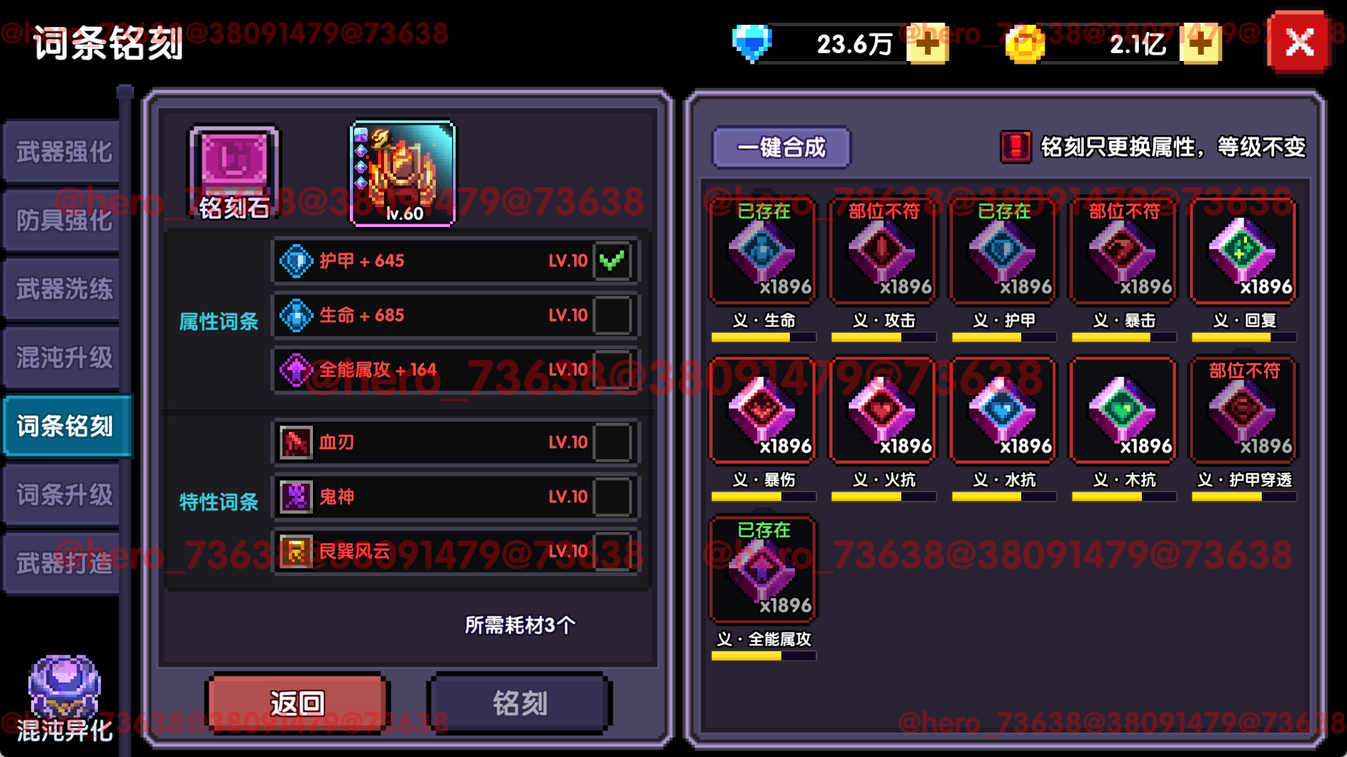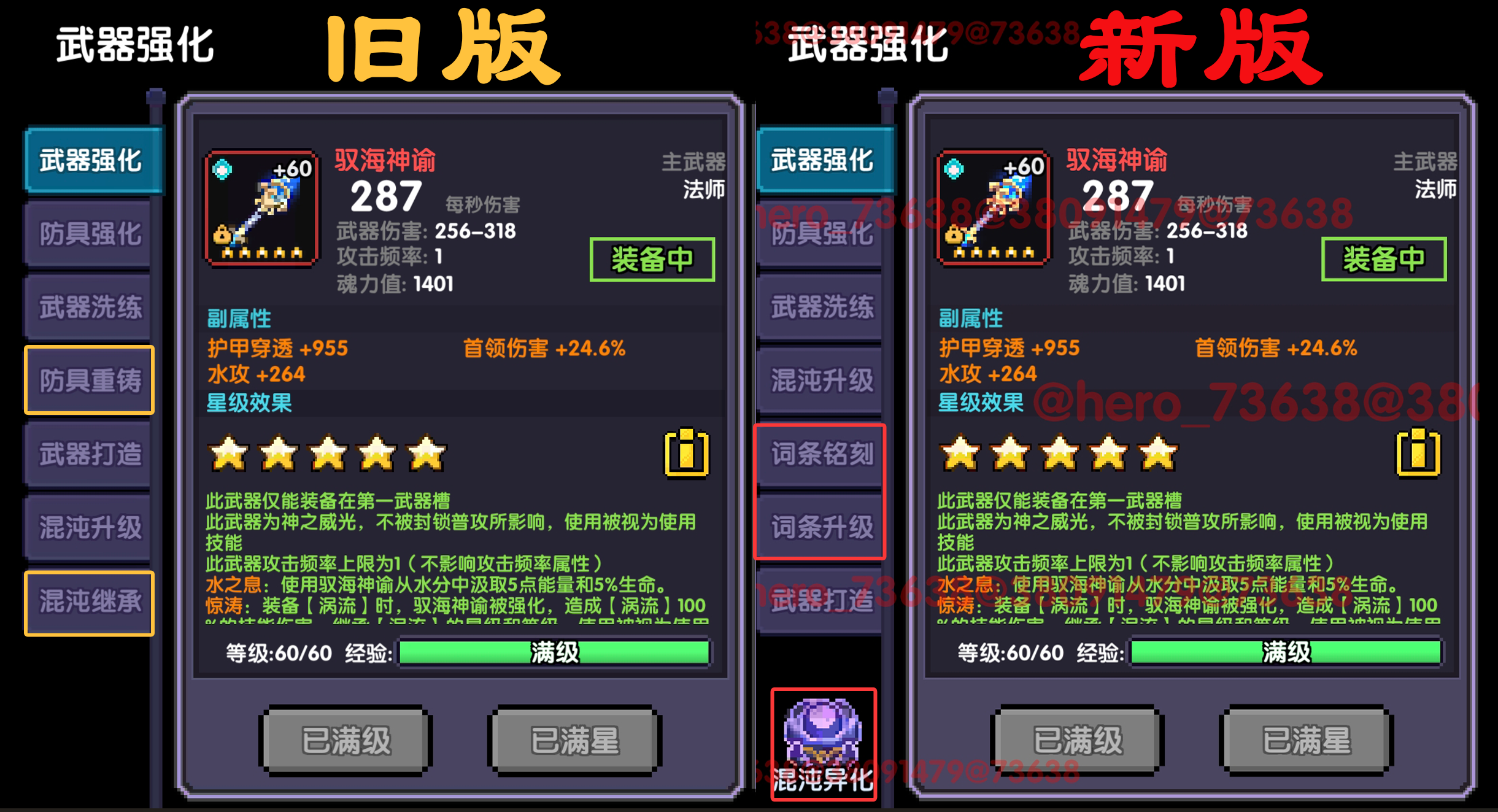 相较于旧版,混沌升级功能也有所变化,并且新版删去了防具重铸和词条继承功能,增加了词条铭刻和词条升级功能以及词条异化功能。接下来我们先从改动后的混沌升级功能介绍,再逐一介绍新功能。