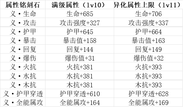 下列是属性词条及其所对应的数值的表格,可以在游戏内打开铭刻石图鉴查看每一级所提供的数值,为节省篇幅,仅放出满级属性和异化到11级后所提供的属性。