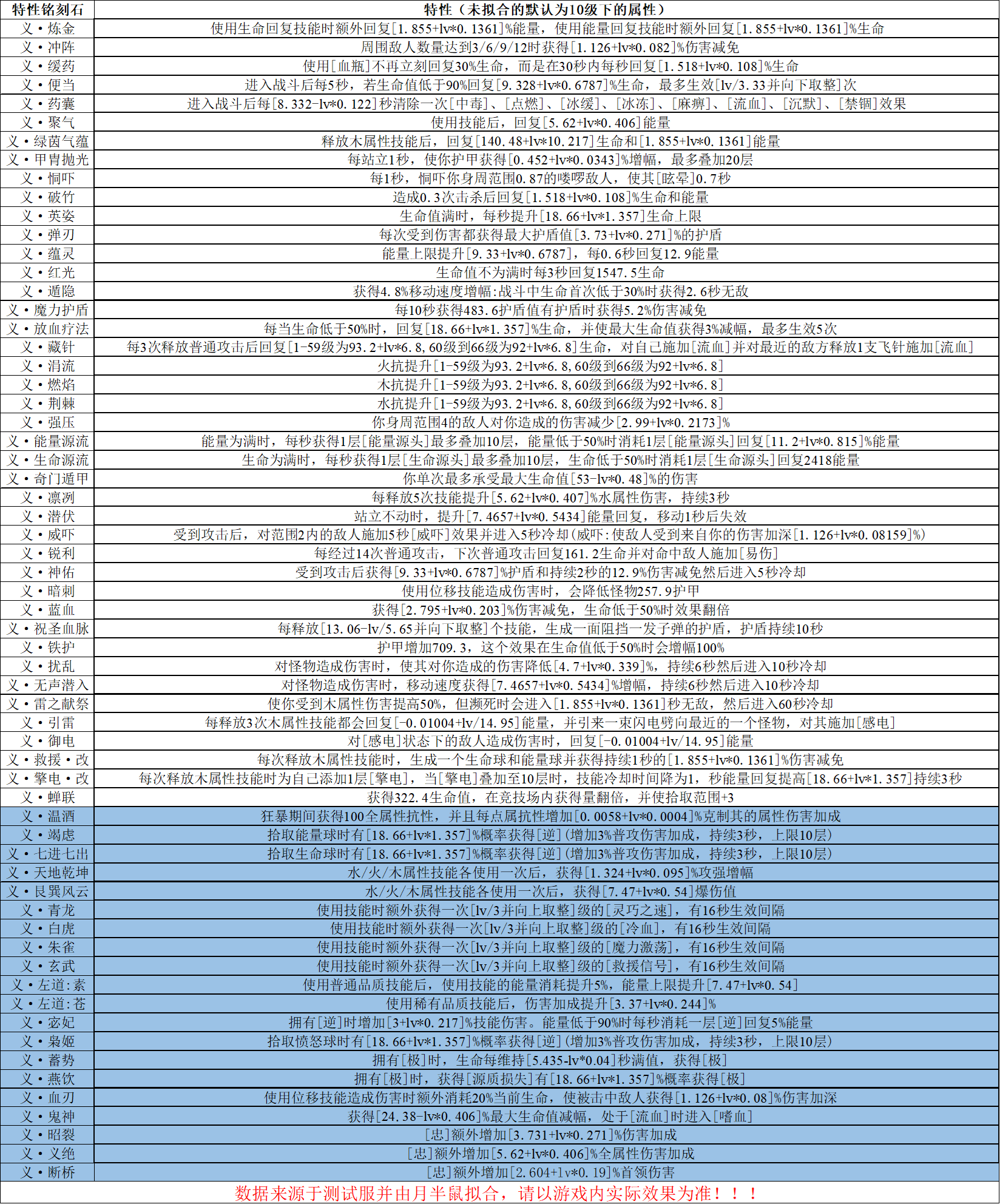 下列是特性词条及其所对应的数值的表格,可以在游戏内打开铭刻石图鉴查看每一级所提供的数值。lv最小为1级,最大为66级。数据来源于测试服,请以正式上线版本为准!!!