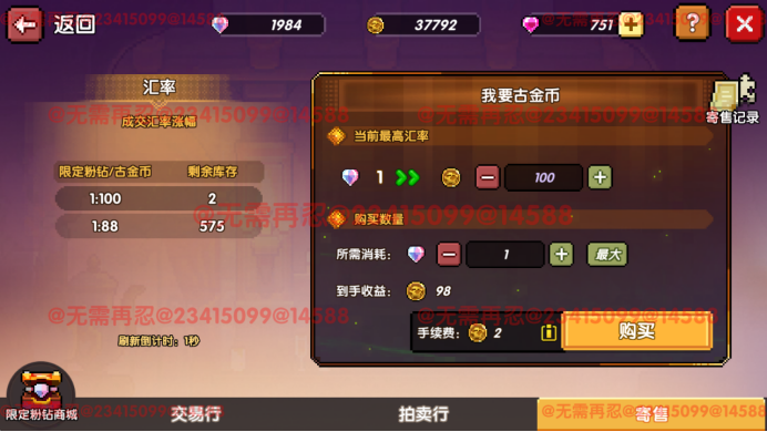 点开寄售界面,左边是当前市场上其他玩家寄售的古金币列表;右边可以设置购买的汇率(限定粉钻:古金币)以及购买数量,每次购买将收取手续费,该手续费包含在购买的古金币中,设置完毕后点击购买即可。