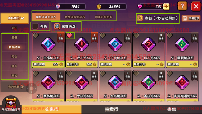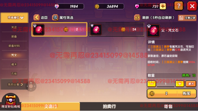 市场会默认将价格低的商品排在前面(左上为前),对于材料类商品,优先选择价格低的进行购买即可,而对于唯一类别商品,如咒文石,因为咒文石属性不同,不一定价格越低就越好,可以点开咒文查看其详细属性。