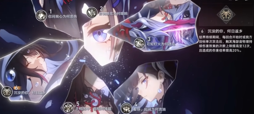 海瑟音的一魂是一个机制加数值都有巨大提升的质变星魂,提供了百分之十几的独立DOT伤害加成,没有任何稀释跟倍率收益乘算,同时让天赋在添加DOT时会额外添加一个相同的DOT,并不是队友攻击一次触发两次天赋,而是添加任意一种DOT时复制一份,比如说添加灼烧时会额外添加一次灼烧,然后再随机添加另外三种DOT。这额外的四个DOT伤害有三个作用,一是海瑟音天赋四种DOT倍率翻倍,二是她的大招能无脑吃满八次,三是增强敌人回合开始时给黑天鹅奥迹的叠层数,对于海瑟音来说提升还是非常大的。