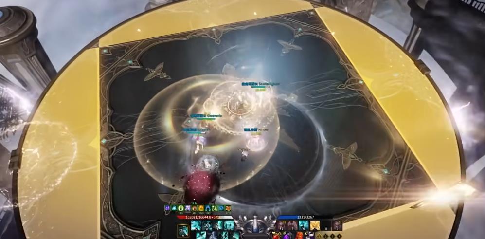 在30-0管血后电圈会被强化,在放置群体伤害的过程会形成蓝色爆炸。黄圈的排法比较单一,都排在半圆弧内即可,而电圈由于存在伤害,建议玩家排放在四周的角落,避免对之后输出造成干扰。boss在55管血后,场地会从圆形破坏成正方形,在半圆弧内的黄圈就会消失,玩家在这个阶段开始就会有坠落的风险。