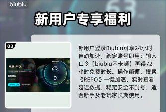 第一次的注册,新用户们是可以得到平台为大家准备的24h新人免费尝鲜礼,没有隐藏收费和捆绑限制,帮助大家成功的摆脱掉帧和延迟的困扰。另外【biubiu不卡顿】这句口令依旧生效,正确的输入小写字母就能够获得72小时的免费优化时间。通过这个福利如果大家使用体验感不错,充值服务也是为伙伴们提供了多个折扣福利的