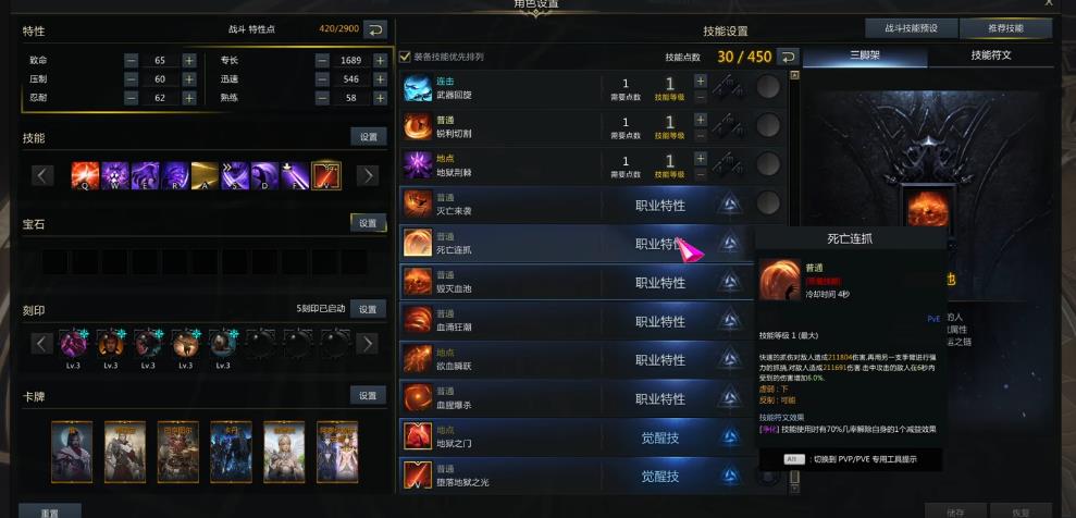 恶魔利刃抑制流针对恶魔割裂与锯齿飞刃的三脚架可灵活调整,其中前者可根据BOSS的体积,在第三排三脚架中点出两段位移,或者点出可以穿过boss的效果。后者的第一排三脚架可以根据玩家的蓝量消耗情况,以及需不需要补充移速吃满铭刻,或者都不需要的时候增加一点出血伤害来抉择。在符文配置方面,如果前期丰富符文数量不足,无法支撑能量循环,可以在反制技能恶魔之掌上额外装配一个丰富符文。