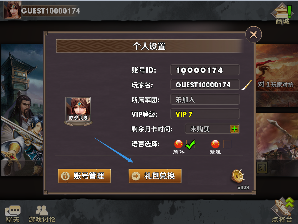 使用方法:游戏主界面—点击【头像】按钮—点击【礼包兑换】按钮—输入礼包码兑换奖励。