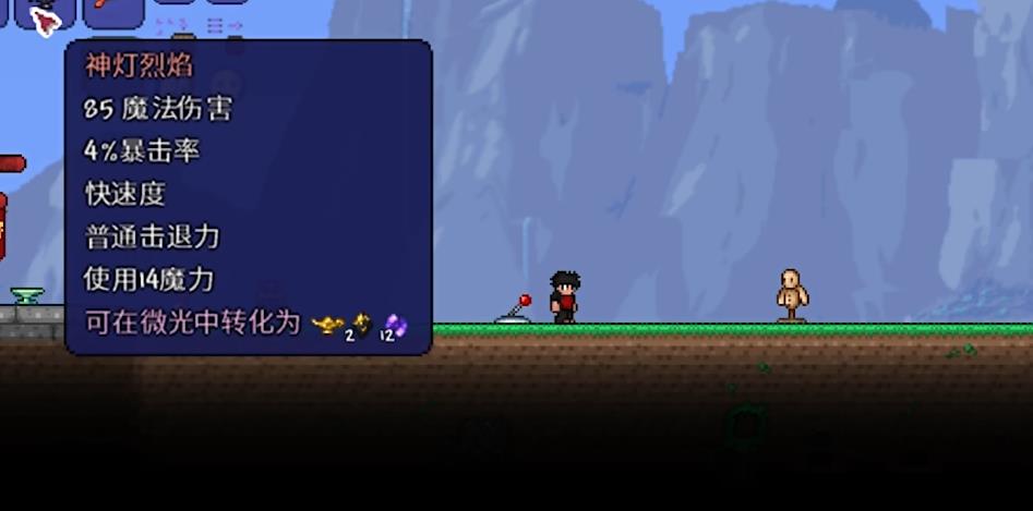 神灯烈焰是在血肉山后过渡阶段里面板极高,仅次于橙色冲击枪的法师武器。获取需要在被腐化或者猩红感染的地下沙漠地心处,刷新出一个特殊的小怪沙漠幽魂,击败后即可获得掉落素材幽魂灯。该小怪的射弹没有任何的碰撞伤害,只有爆炸才有,且范围小伤害不高,算是法师类型的怪物里最没有威胁性的一个。另外两个素材是十二个暗影之魂和两块禁戒碎片,制作方法较为困难,尤其是地下沙漠没感染还变成神圣地下沙漠的时候。
