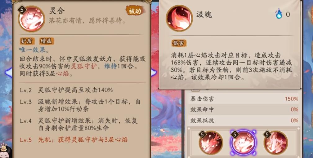 在斗技里则搭配攻攻爆的网切,同样为满暴击的爆伤套,通常与须佐或季搭配使用,在道馆和斗技场景中二、三技能均需升满。当敌方出现残血目标时,三尾狐会自动释放汲魂,且汲魂会附加狐引效果。该式神的就业主要依赖汲魂机制,在极地鬼中可与季搭配,连招机制是季先行动,接着怪物再继续行动,接着季灵造成伤害,然后便能触发本真三尾狐的汲魂伪回合,从而触发季灵的伤害并守卫。