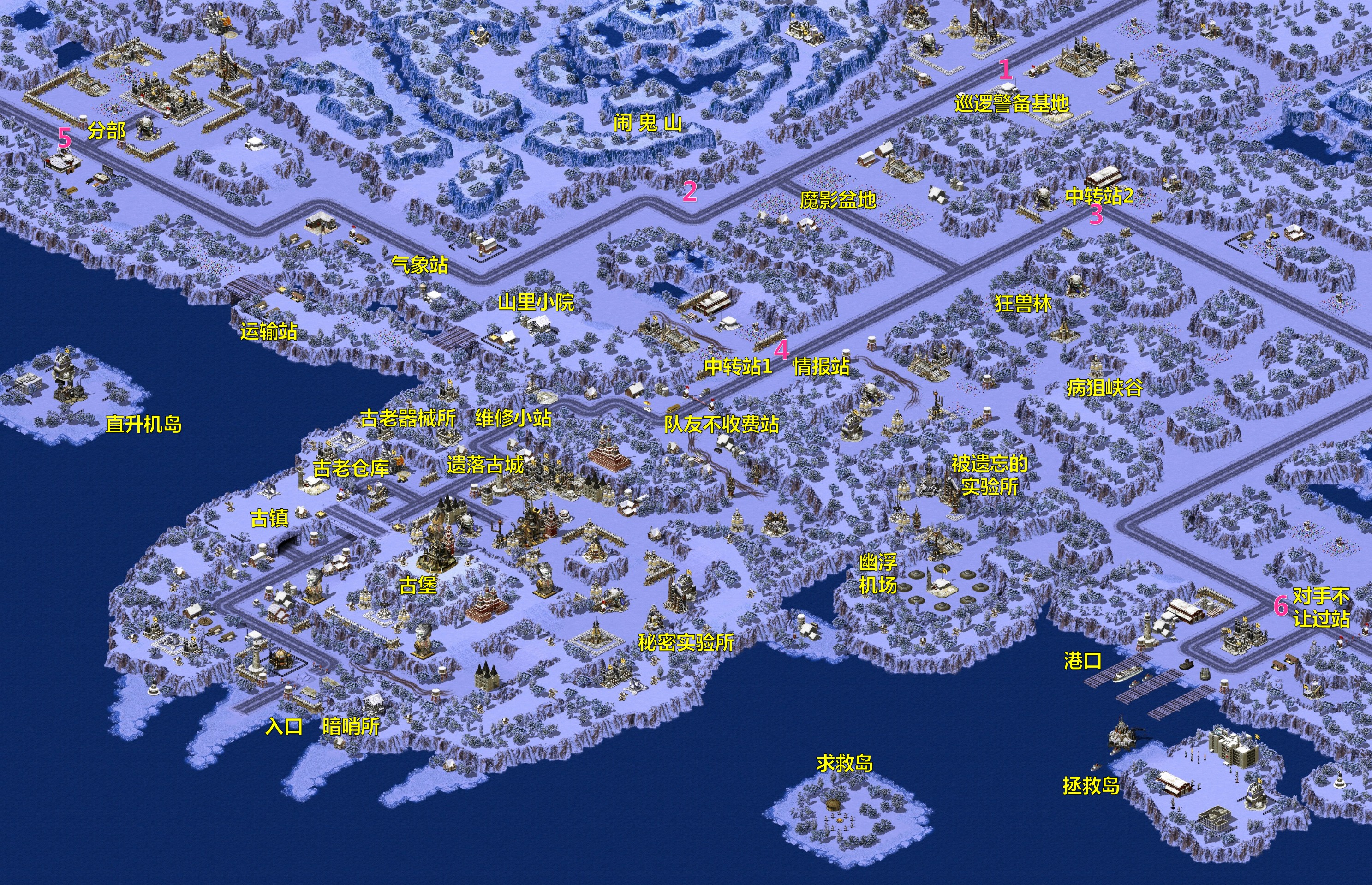 这关有点坑啊,开始就一个白衣特种兵,三个大兵,一个间谍,一个工程师,和一部载人机车。我先用间谍开了地图,但大部分都是山过不去,而且会有巡逻的尤里部队,所以小心一点还要多存档,不然不知道什么时候就成别人的了。地图一出,所有人上车,然后用最省血的方法将路上敌车和人干掉,然后可以升三级机车。