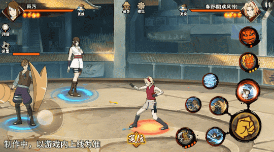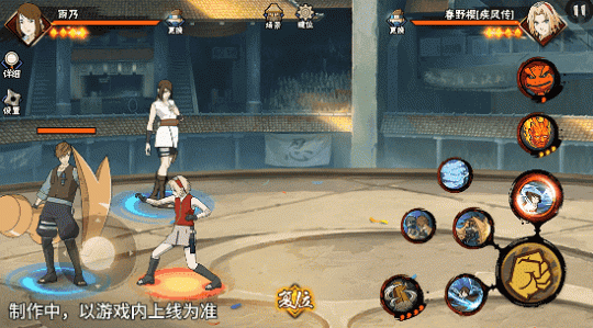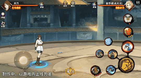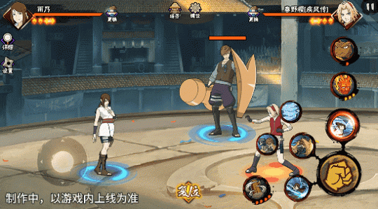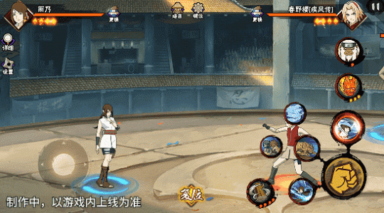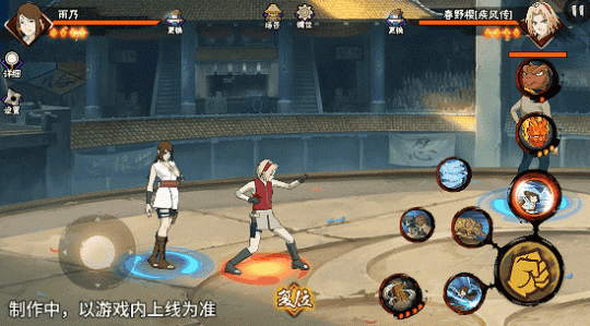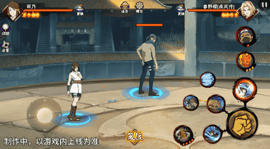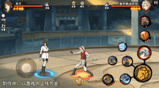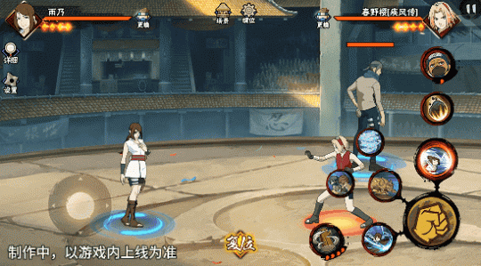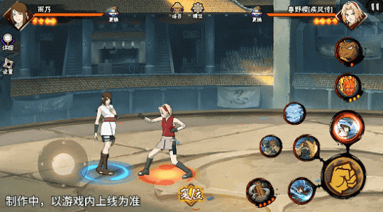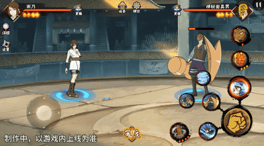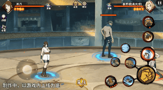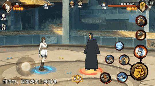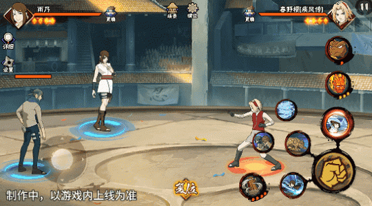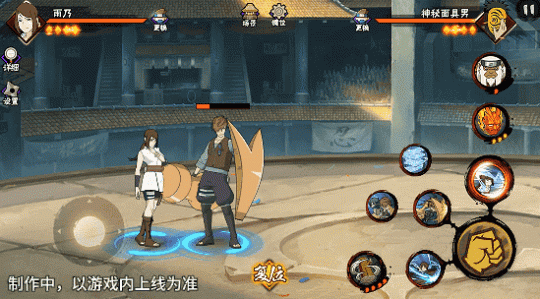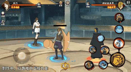 若在不同队友释放二技能后使用一技能,可以触发不同效果。在光司的砂严拳命中并击飞敌人后释放一技能,雨乃会瞬身到空中,使用医疗水遁·水螳螂俯冲斩击。