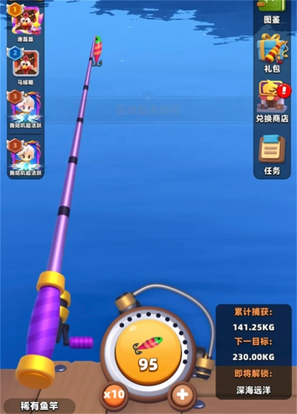 2:钓鱼可通过鱼上钩的力度判断其是什么鱼,多钓几次即可,鱼超过125m或者力度超过进度条就会断线,具体看不同鱼杆。