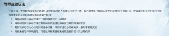 除此之外,近期更新的导师互助玩法非常不错,你可以直接通过江湖同游”结识师傅,也可在专属频道或者直播询问自己不理解的问题。可以说,哪怕你从来没玩过这款游戏,只需找个靠谱的师傅,就能解决你一切烦恼。此外,你也可以加入玩家搬砖交流群,里面个个都是人才,说话又好听,非常有利于自己在游戏里的发展。