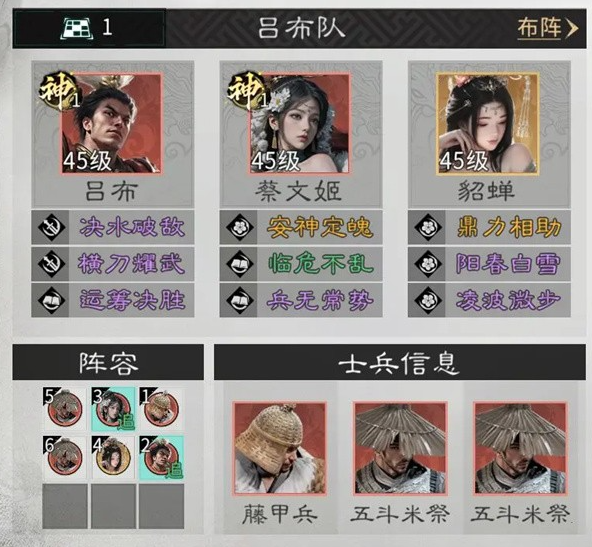 2、兵种站位:蔡文姬前方放置一名藤甲兵,用于吸收伤害、保护后排。
