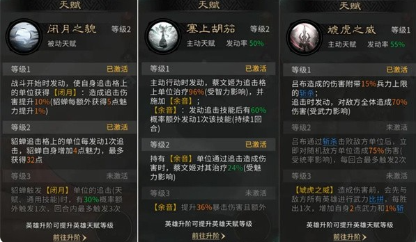 2、蔡文姬发动天赋【塞上胡笳】,为追击格上的单位施加【余音】效果,使吕布在追击时有概率额外发动一次追击技能,大幅提高其出手频率。