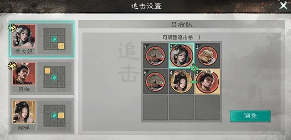1、英雄站位:貂蝉不占用追击格。吕布站貂蝉的追击格,并与蔡文姬互站追击格。