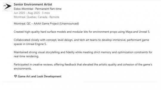 根据Derian McCrea的linkedIn个人资料显示,他于2025年6月至8月期间在Eidos Montreal工作,参与了这项未公布的项目。他在描述中提及,自己使用Maya和虚幻引擎5创建了高质量的环境道具硬表面模型与模块化套件”,并与概念设计、关卡设计和技术美术团队紧密合作,在虚幻引擎5中开发具有沉浸感且性能优良的游戏场景”。这些描述,加之他曾参与创意评审团队并提供反馈、致力于维护强烈的视觉叙事和保真度”等信息,均暗示该项目可能已进入相当深入的开发阶段。