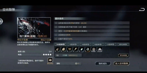 1、应对地穴魔蛛可选用邪神套装,在英雄裂隙接取对应挑战任务。需综合装备等级≥63级,高战力玩家可单人应战,也能组 2-4人队伍。额外条件:挑战BOSS前必须清完所有小怪,身上特定装备等级不可超过10级。