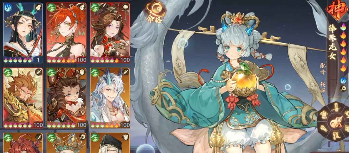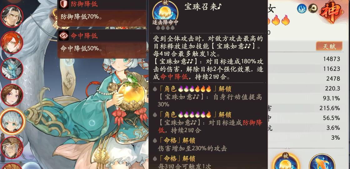 捧珠龙女的核心机制是眩晕降速,不仅普攻有概率附加沉默,大招还能对敌方全体眩晕和降低速度。其中眩晕是硬控效果,打PVE群攻小怪非常好用,在PVP如果想解控,就得上高翠兰。在激活命格后的宝珠如意可达到230%,搭配灵台方寸能增伤,连招合理可打出一波流伤害。由于她能眩晕敌方全体,能够有效克制速攻队,搭配我方强力单体输出,可快速让对手减员来增加胜算。