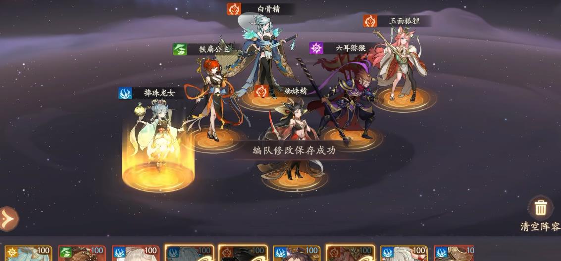 强力单体输出角色首推白骨精,擅长攻克敌方前排护盾高的角色,撕裂敌方阵容打开突破口。还可选择铁扇公主,在三彩时即可为十字范围内队友增加攻击力,但是切记龙女不能放在铁扇的十字范围内,对技能伤害的免疫会让其丧失反击的机会。如果追求速攻的话,可以以搭配擅长推条且附带沉默的蜘蛛精,擅长全体拉条的玉面狐狸等。